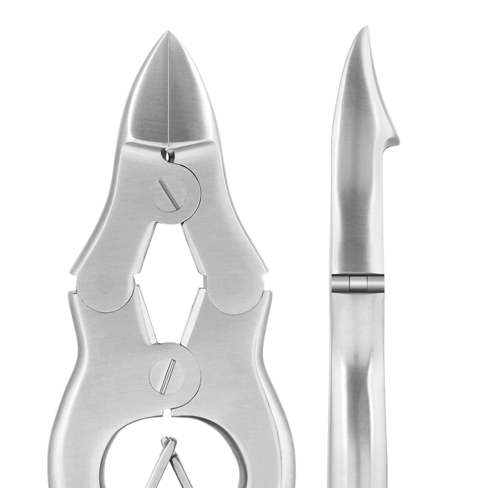 Das doppelte Gelenk ermöglicht es, selbst die dicksten Nägel mühelos zu kürzen, während der gerändelte Griff einen festen Griff des Instruments ermöglicht.