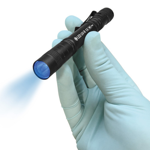 Lampe en forme de stylo pratique, légère et maniable, avec étui métallique de protection pour le rangement à la fin du travail.